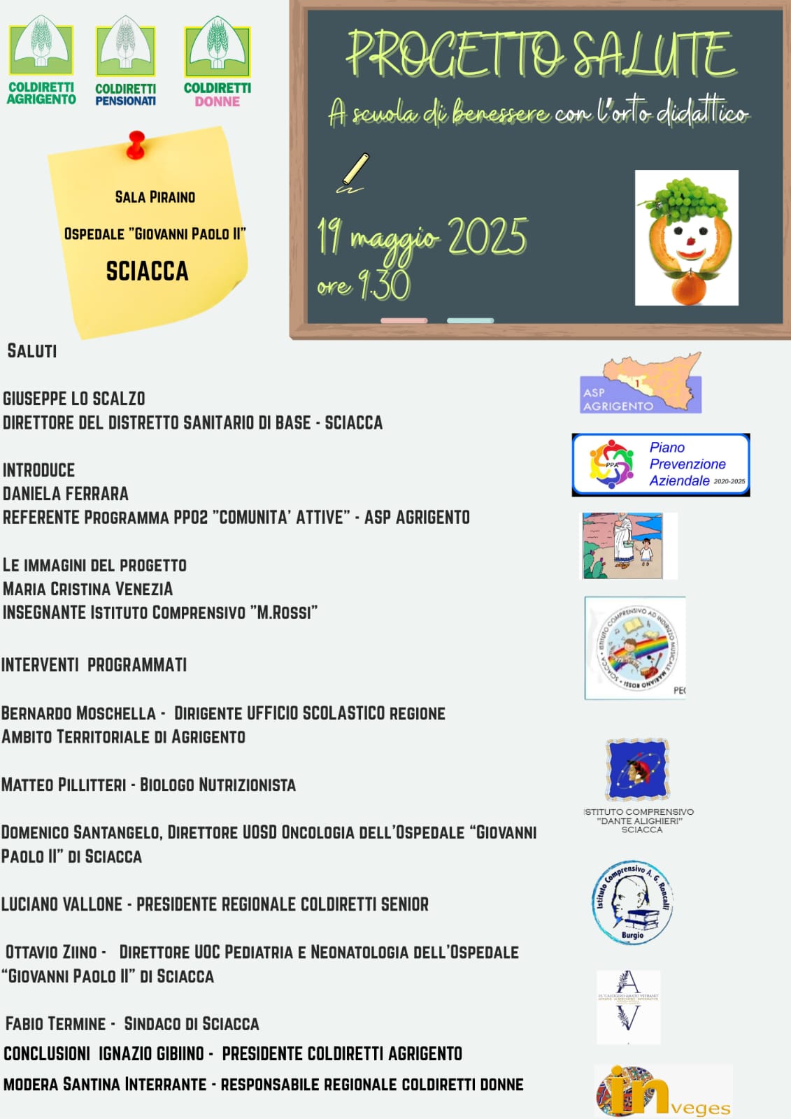 Lunedì 19 maggio 2025 dalle 9.30 nella Sala Piraino del P.O. di Sciacca si tiene un incontro nell’ambito del Progetto Salute sul tema “A scuola di benessere con l’orto didattico”. L’incontro è realizzato tra le attività previste dal Piano di Prevenzione Aziendale e del Distretto sanitario di Sciacca in collaborazione con le scuole, altri Enti del territorio, Terzo settore e Ufficio scolastico Provinciale.